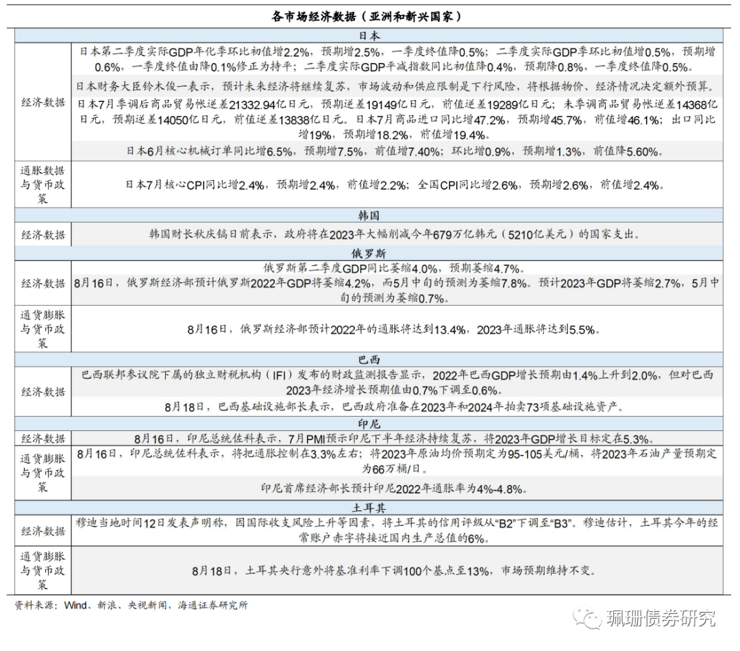 美国。主权债:美债下跌。22/8/12-22/8/19,1Y、2Y美债利率与上周持平,10Y美债利率上行14bp至2.98%;10Y-2Y美债利差倒挂幅度由8月12日的41bp缩窄至27bp。信用债:高收益债指数下跌。