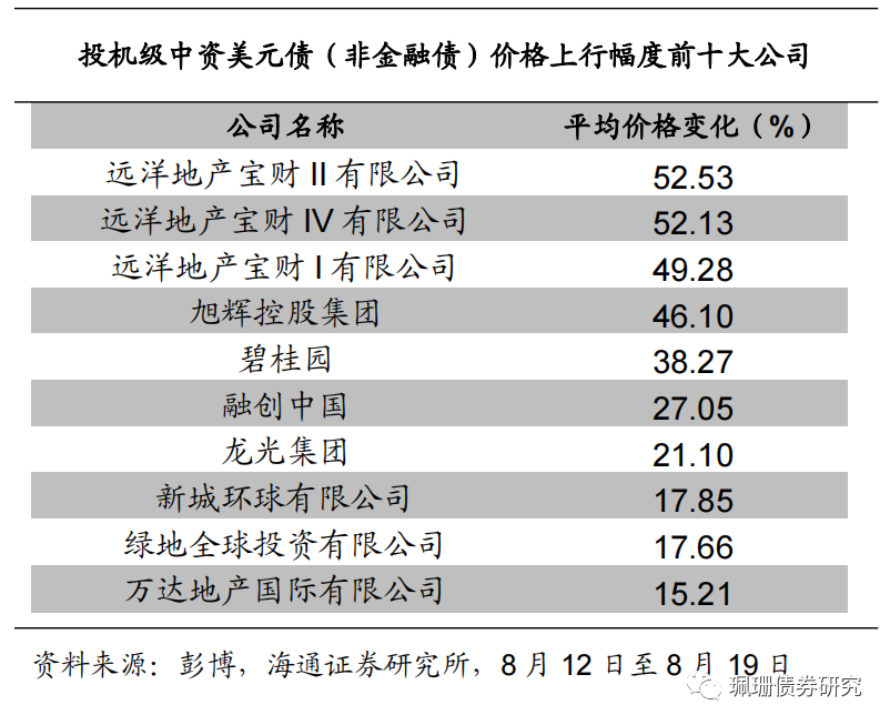 上周投机级中资美元债价格平均上涨0.24%。具体来看,投机级中资美元债发行人的价格平均上涨。价格上涨幅度最大的发行人为远洋地产宝财II有限公司,价格上涨幅度最小的发行人为路劲基建海外金融2017(A)有限公司。