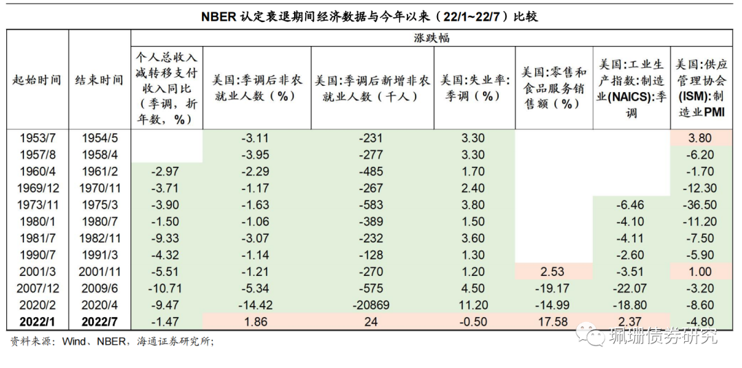2)但是,GDP环比增速本身受扰动因素影响较大,不是NBER参考的六个指标之一。目前,其余主要指标离实质性衰退尚有距离。观察1950年以来历次NBER衰退期间各经济指标表现,可以看到,就业和个人收入同比均在衰退期间出现明显下降。而今年以来,除个人收入同比和制造业PMI指数略降之外,其余经济指标均表现较好,尤其是在服务业复苏带动之下,劳动力市场表现强劲。