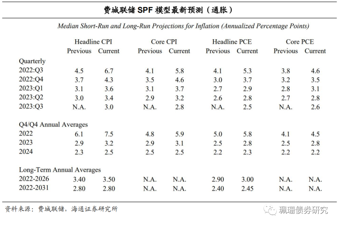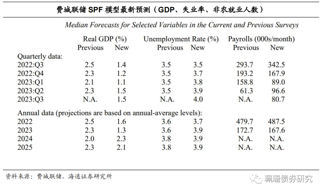 费城联储SPF将2023年实际GDP预测下调至1.3%。专业预测者调查(Survey of Professional Forecasters,SPF)是美国最悠久的宏观经济预测季度调查之一,费城联储于1990年接管这项调查。其预测小组成员包括了来自经济金融学界以及业界的专业人士,因此一定程度上可反映市场对于未来经济的看法。预测小组成员每季度对经济数据进行预测一次,并选取预测中位数公布。