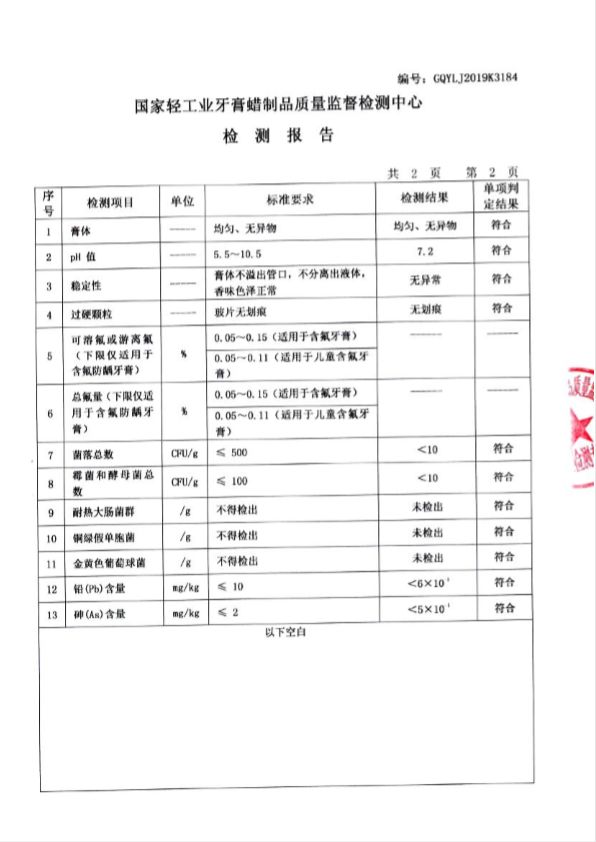 牙膏经过国家轻工业牙膏制品质量监督检测中心的严格检测(编号:GQYLJ2019K3184),所有检测项目均符合国家标准,安全可靠!