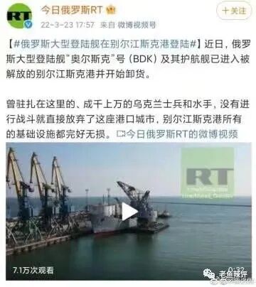 俄军在南部的形势要好一些,毕竟那里靠近俄罗斯本土,还有著名的黑海舰队。前天,俄罗斯媒体报道了俄军大型登陆舰进入乌克兰南部亚速海港口城市别尔江斯克的消息。就是上面这艘船,装载了20辆坦克、45辆装甲车和400名伞兵。视频显示,别尔江斯克的码头一艘俄军1171型登陆舰在乌克兰军队攻击中被摧毁,另外两艘775型登陆舰受损。与此同时,G7峰会昨天在布鲁塞尔召开,欧盟、欧洲理事会和北约领导人也应邀参会。这次会议后发表了联合声明,表示谴责俄罗斯,支持乌克兰,在继续给乌克兰提供更多的防空导弹的同时,还要再提供一批反舰导弹。不过,俄军也不是完全没有好消息,他们在马里乌波尔的进攻取得了缓慢的推进:马里乌波尔是乌克兰南部一个美丽海滨城市,人口45万,俄罗斯族人接近一半,80%以上的人说俄语,按照普京的说法,他们就是去解放在乌克兰受纳粹迫害的俄罗斯族人民的。