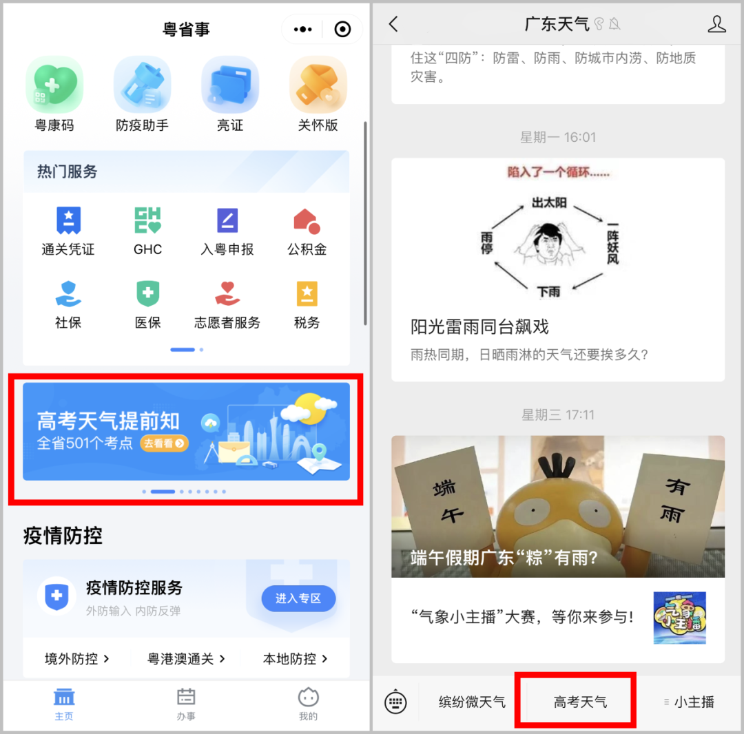 5月2日起,考生及家长可以通过“广东省教育考试院”微信公众号、“广东天气”微信公众号、“粤省事”小程序及“缤纷微天气”小程序,查看考点的天气预警信息、天气实况、分钟级降水、逐时预报和7天预报等天气服务信息。