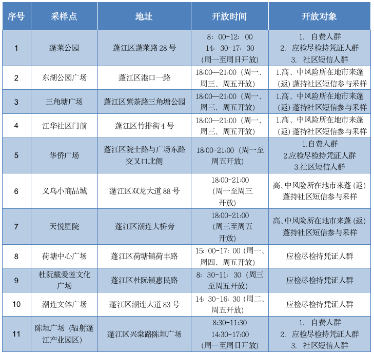 蓬江区卫生健康局医政医管股副股长钟慧说:“不同的便民采样点面向的市民是不同的。荷塘中心广场、杜阮戴爱莲广场和潮连文体广场采样点只向部分重点职业人群开放。像东湖广场、三角塘、江华社区(等)5个采样点暂时只面对中高风险所在地市来(返)蓬人群。每个采样点的开放时间也有点不同,大部分安排在18时至21时这个时段。请市民可以注意开放对象和开放时间。”