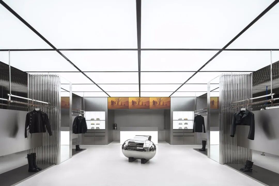全铺无影灯膜天花的运用则在最大程度上褪去属于外界的噪音,让空间聚焦服饰本身,极大程度上延长了空间的使用周期。