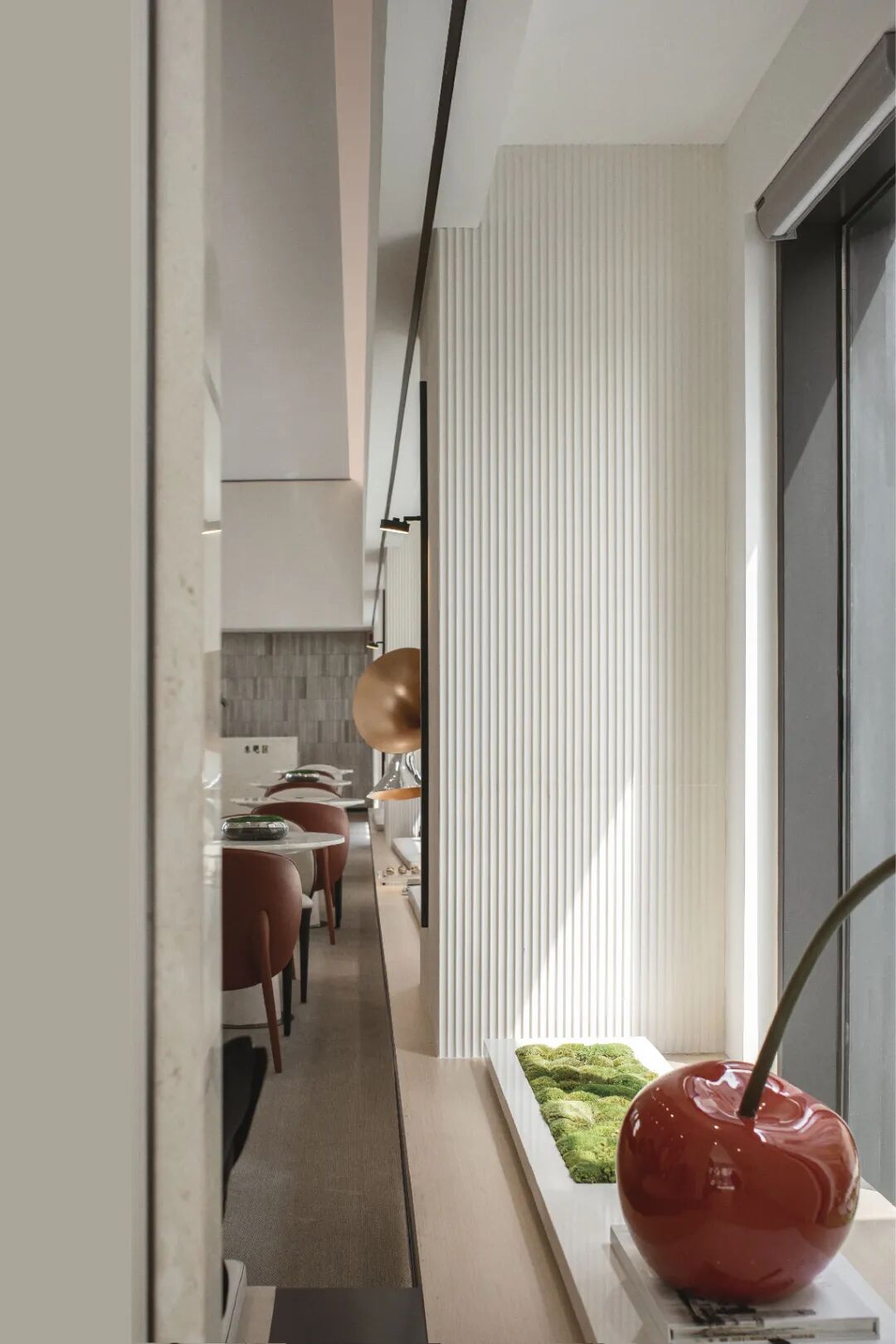 当拉近空间镜头时,一件活泼潮趣的金属玩偶、洋溢着自然气息的花材与枝叶、鲜红灵动的樱桃,跃然于眼前,焕发出空间的时尚魅力。