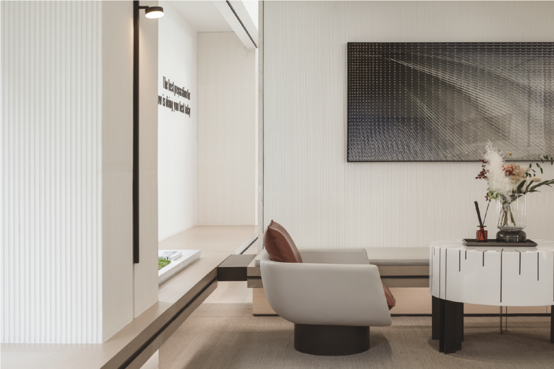 “从设计技法角度上讲,极简手法下的点线面构造,不止与几何、线条语素相对应,其中更关乎材质与工艺,它们的存在交织为一个整体,共同构就着空间的表现形式与观感。”