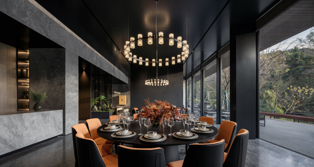 两层挑高的宴会厅,圆形造型艺术品从天花垂下,餐桌以“圆”与之回应,礼遇东方。景观设计师在对应餐桌的院内放了一湾浅浅的水池,晴日间发现,在室内天花上波光粼粼,整个空间变得明亮妩媚。