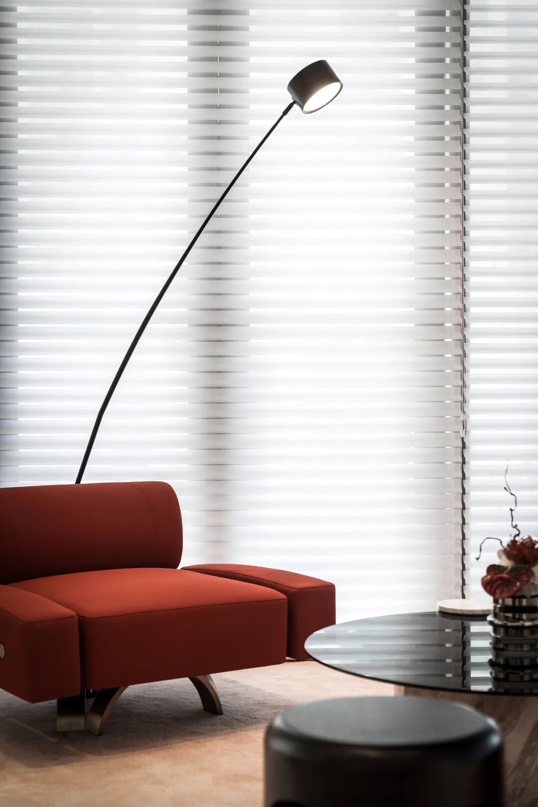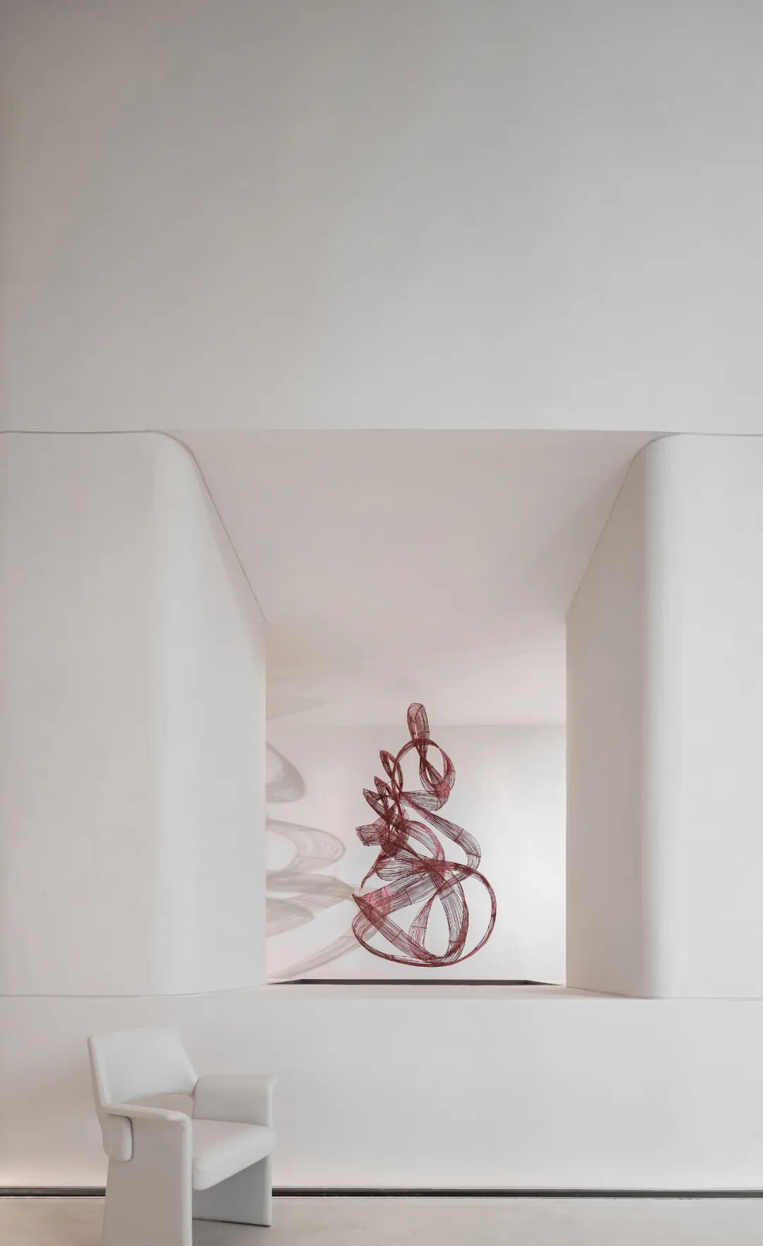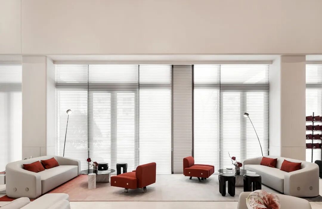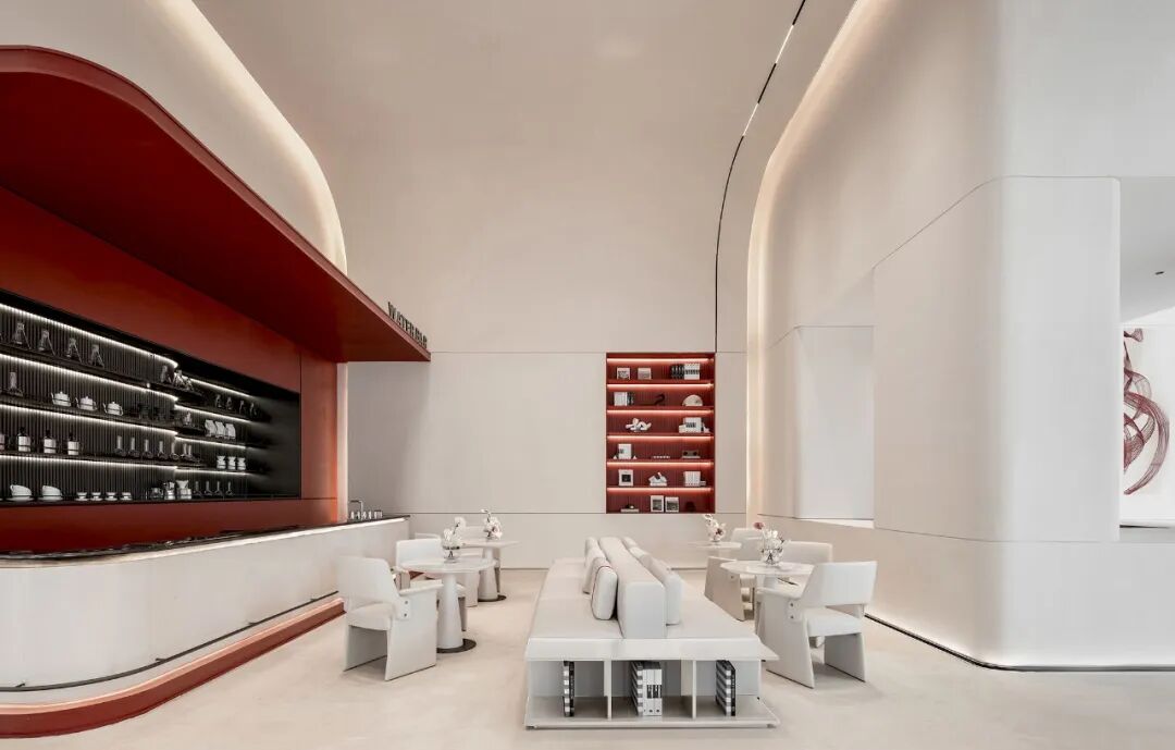 一抹红跃动于空间之中,浓烈不乏沉静,美艳却又充满克制,纯净简约的米白基底,描摹出纯粹灵动的空间场景,留白、包容、沉浸,让空间留存与承载更多的情绪与可能。