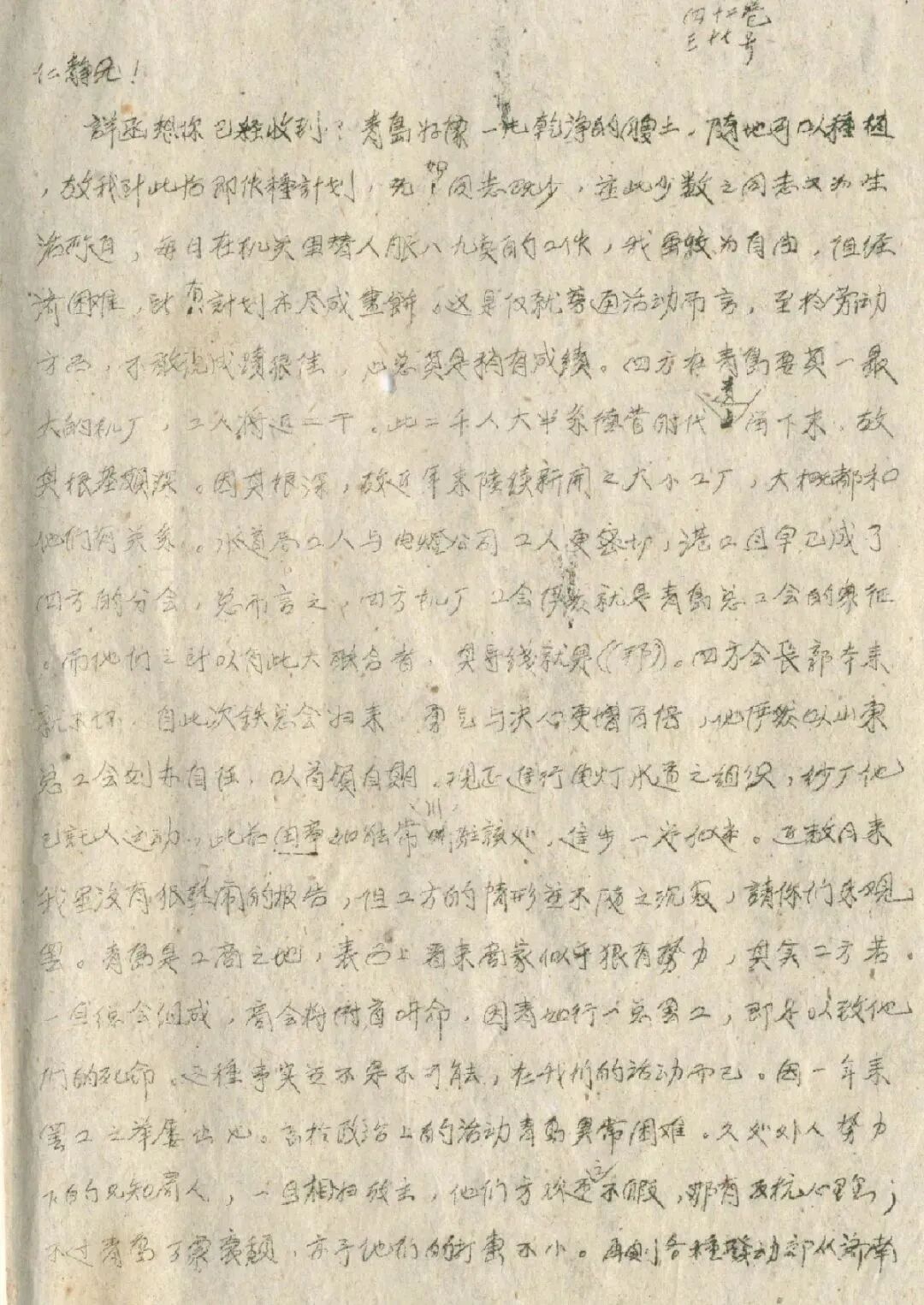 邓恩铭关于青岛工运等问题致仁静信(局部)(微信公众号“灯塔党建在线”)