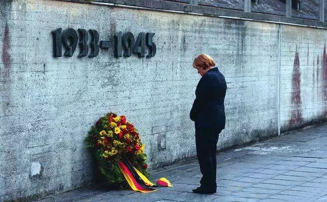 2015年5月3日,在德国达豪纳粹集中营纪念馆,德国总理默克尔向死难者敬献花圈