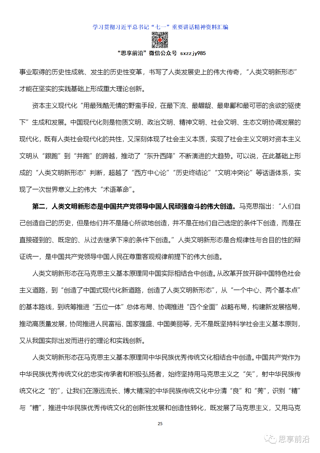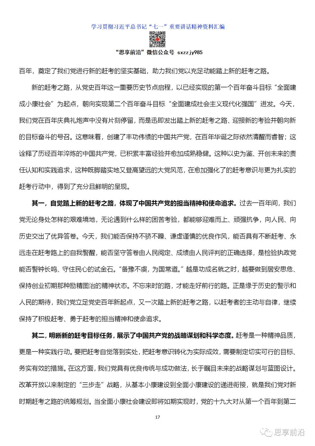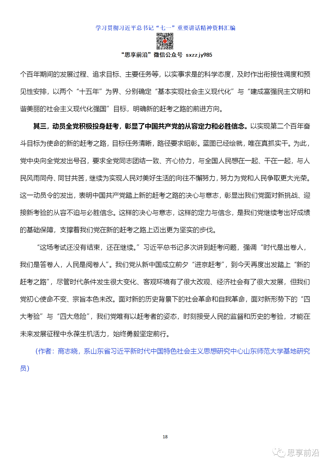 习近平总书记“七一”重要讲话是一篇光辉的马克思主义纲领性文献,具有深厚的政治分量、理论含量、精神能量、实践力量。这篇文献提出了一系列新论断,标志着我们党对共产党执政规律、社会主义建设规律、人类社会发展规律的认识提升到了新的高度。