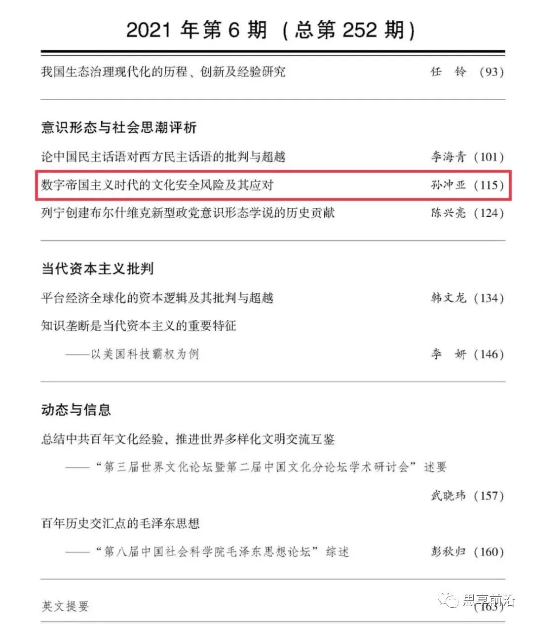 上海交通大学马克思主义学院2019级博士研究生孙冲亚的学术论文《数字帝国主义时代的文化安全风险及其应对》,独立发表在权威刊物《马克思主义研究》2021年第6期。此前,上海交大马院在读博士生独立或以第一作者在《马克思主义研究》上至少发表三篇论文,近年几乎每年一篇,在全国马院中名列前茅。