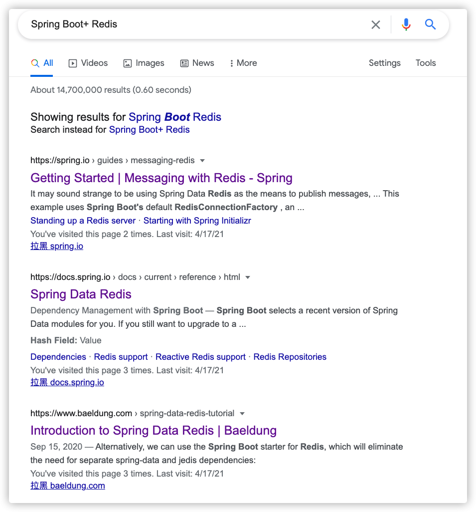 再比如你不会使用 Redis ,你做的 Spring Boot 项目需要用到的话,你直接搜“Spring Boot+ Redis”就出来了各种详细的教程。