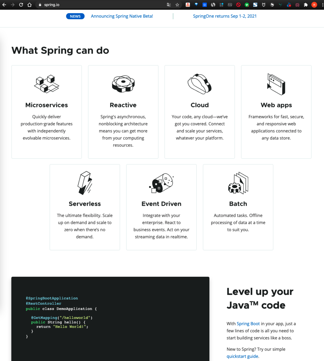 比如下面是 Spring 的官网,通过网站首页你就可以大概知道 Spring 可以帮助你: