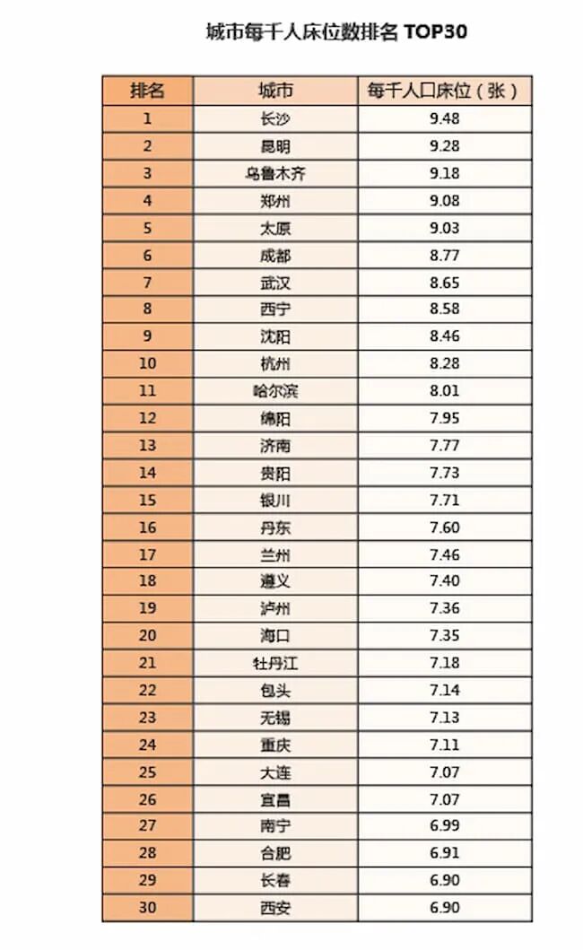 下面是2019年每千人医院床位数排名最高的30个城市,长沙位列第一!