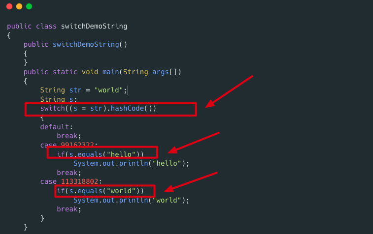 看到这个代码,你知道原来字符串的switch是通过equals()和hashCode()方法来实现的。还好hashCode()方法返回的是int,而不是long。