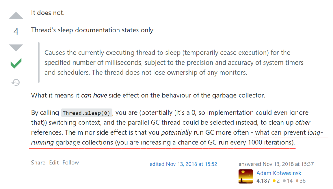 这个的回答说:通过调用 Thread.sleep(0) 的目的是为了让 GC 线程有机会被操作系统选中,从而进行垃圾清理的工作。它的副作用是,可能会更频繁地运行 GC,毕竟你每 1000 次迭代就有一次运行 GC 的机会,但是好处是可以防止长时间的垃圾收集。