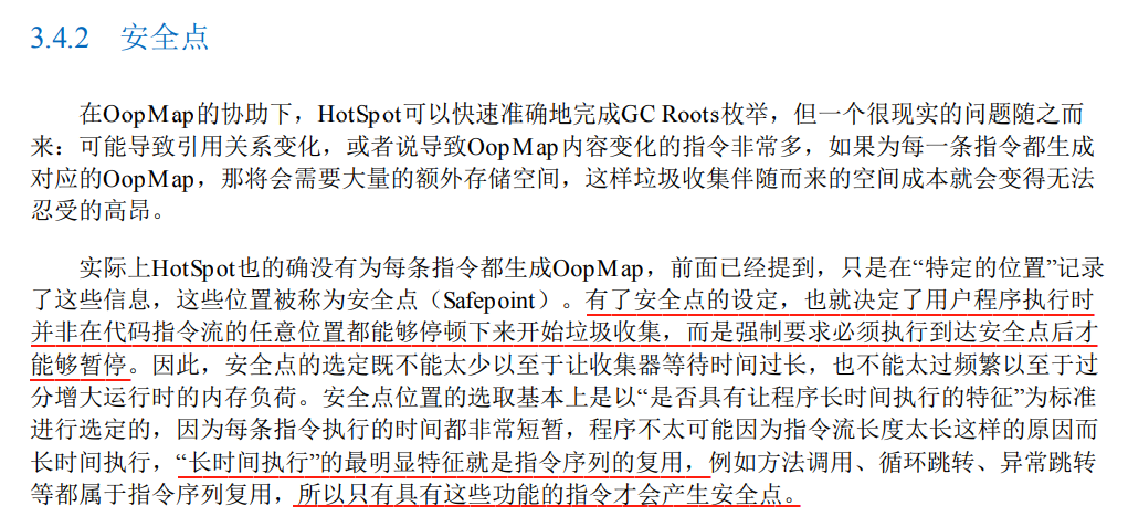关于安全点的描述,我们可以看看《深入理解 JVM 虚拟机(第三版)》的 3.4.2 小节: