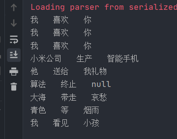 完成上面的步骤后,调用MainPartExtractor工具类中的方法,进行一下简单的文本 SPO 抽取测试: