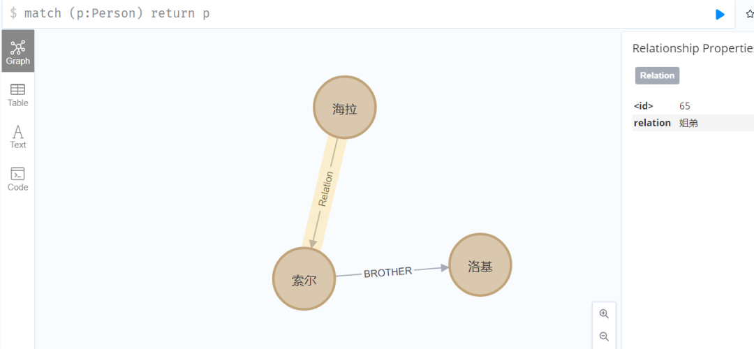 调用完成后,我们再来看看 Neo4j 中的图形关系,可以看到海拉、死亡女神、索尔、锤这些实体被关联在了一起: