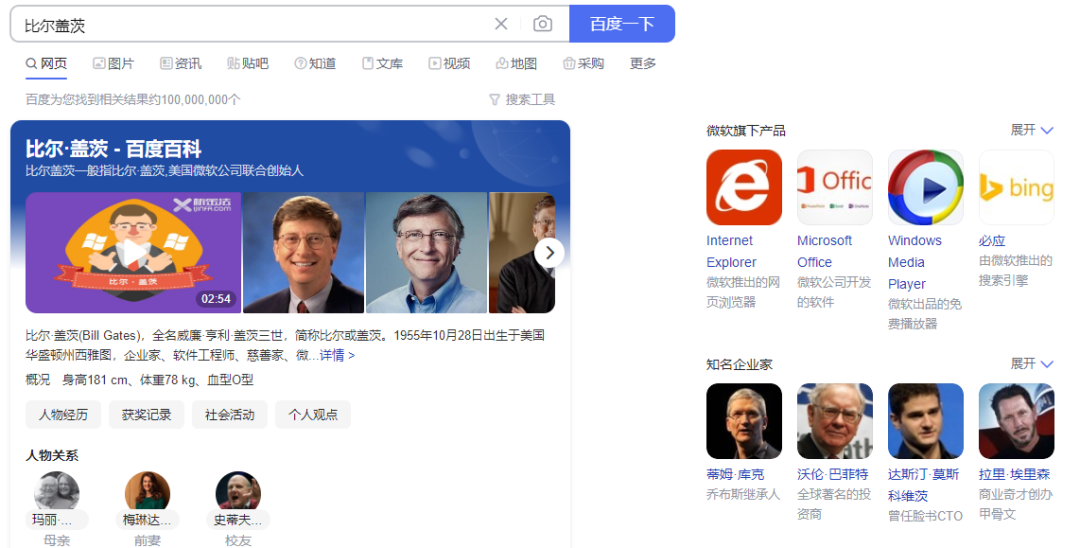 在上面的图中,左侧百科会把比尔盖茨的主要情况列举出来,右侧显示比尔盖茨的微软产品和与他类似的人,主要是一些 IT 行业的创始人。这样,一个搜索结果页面就把和比尔盖茨的基本情况和他的主要关系都列出来了,搜索的人很容易找到自己感兴趣的结果。