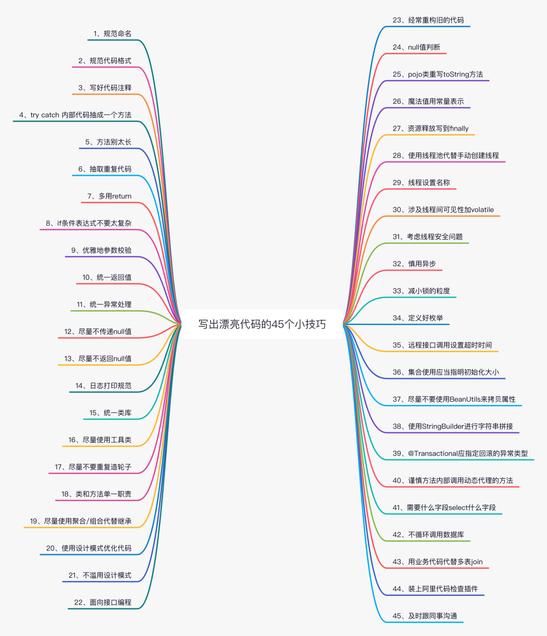 其实造成这些原因的很大一部分原因是由于代码规范的问题,如果写的规范,注释好,其实很多问题也就解决了。所以本文我就从代码的编写规范,格式的优化,设计原则和一些常见的代码优化的技巧等方面总结了了 45 个小技巧分享给大家,如果不足,欢迎指正。