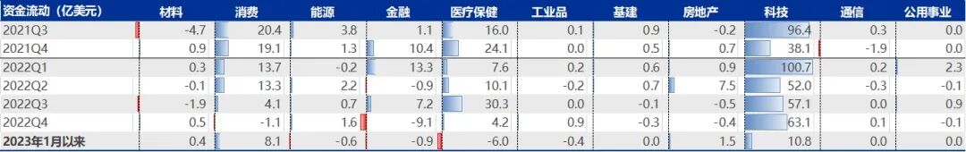 全球股市风格资金流向:全球资金流出美股成长型基金大于价值型基金。中国股市方面,1月以来资金整体净流入,其中持续流入科技行业,拐头流入消费、房地产;大幅流出医疗保健、金融、能源。