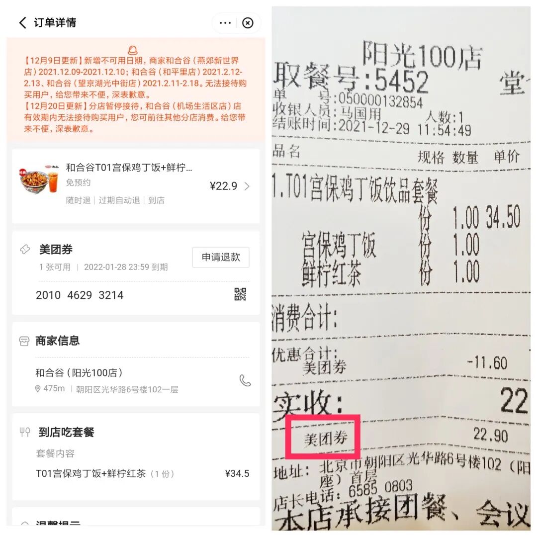 (美团小程序团购订单页面及线下核销小票)