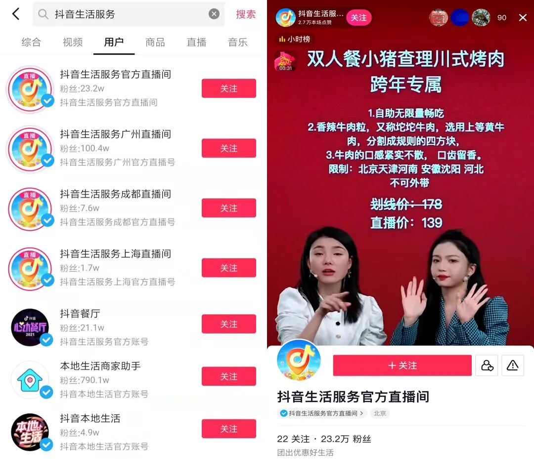 (抖音App内的本地生活直播间“矩阵”)
