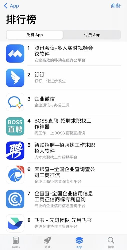 在办公服务赛道,横亘在飞书面前的是短时间内难以逾越的对手。据苹果应用商店中国区数据显示,截至2022年9月23日,腾讯会议夺得商务类免费App下载量第一,后面紧接着的是钉钉和企业微信,飞书排在第8位。