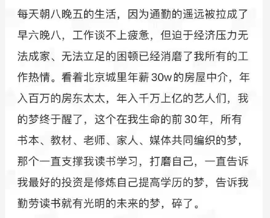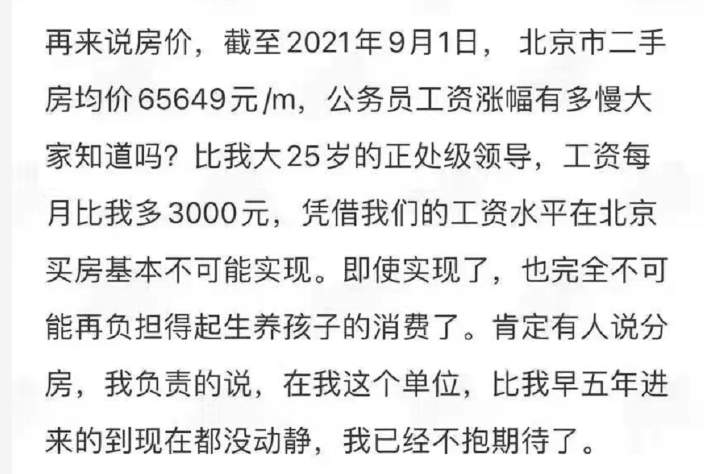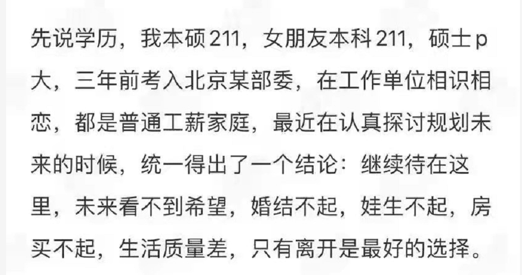 显然,这个警察网友所写下来的东西,只会让那个网友更坚定离开北京的决心,没想法,他和女朋友那么高的学历,那么好的福利条件,依然还是在北京要买不起房子,如果要买房子,就要养不起孩子了。