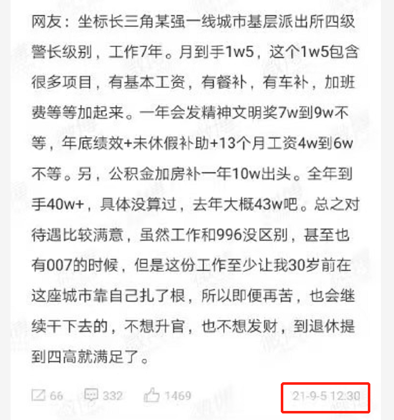 或许是为了对比,昨天中午又有长三角地区的警察网友贴出了他的收入,工作七年,月收入一万五了。