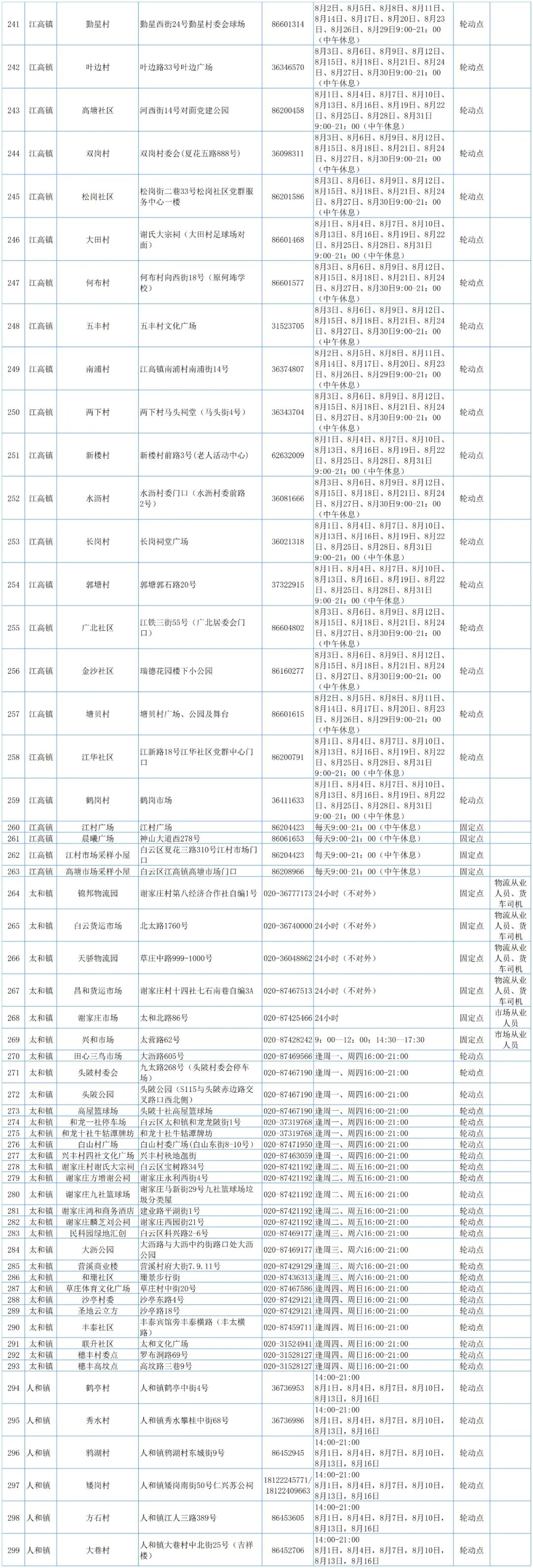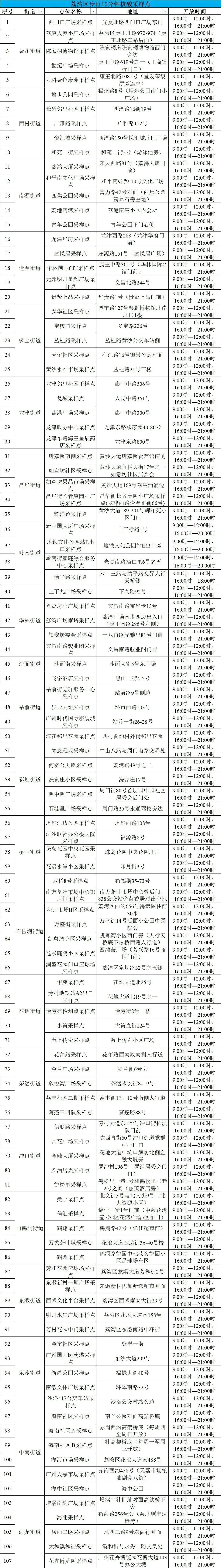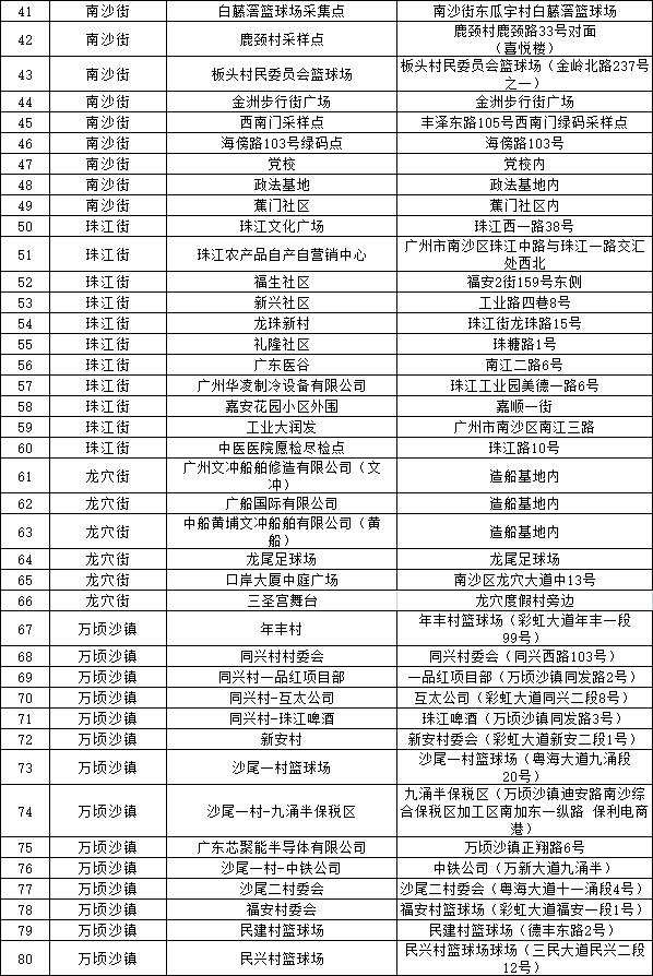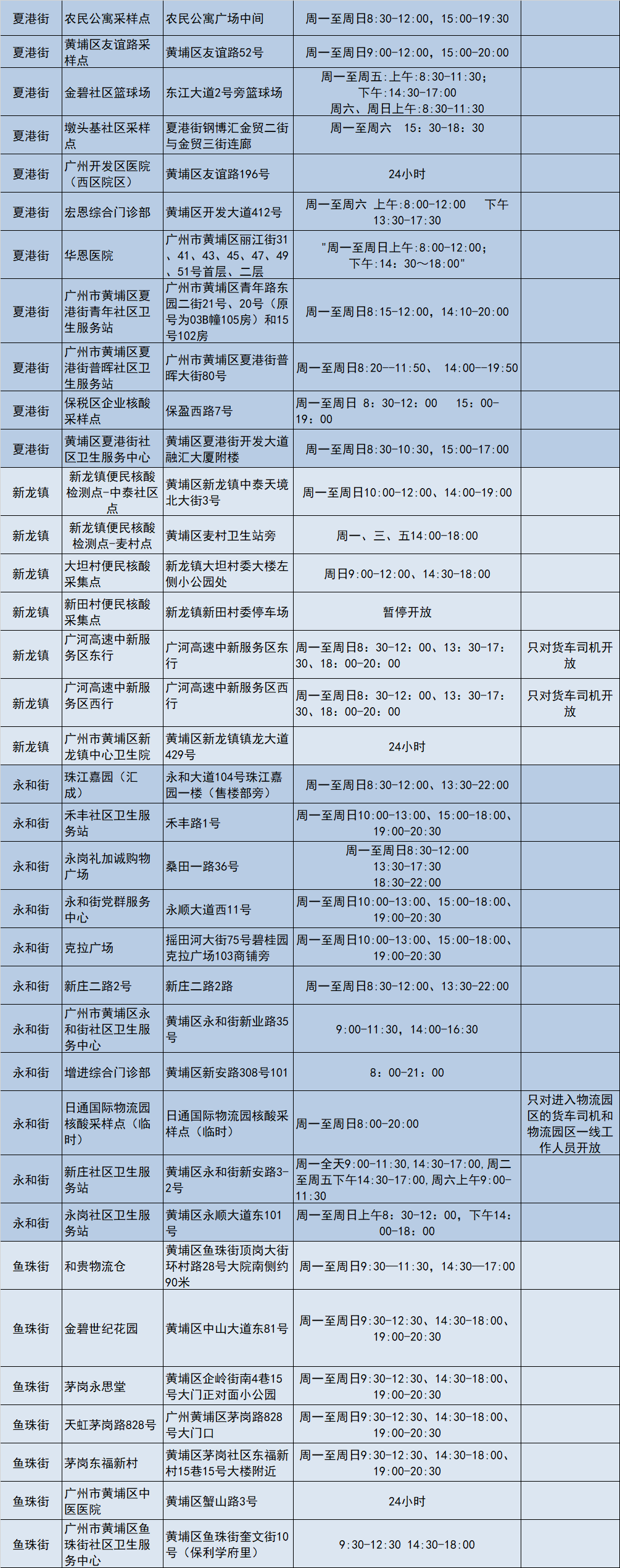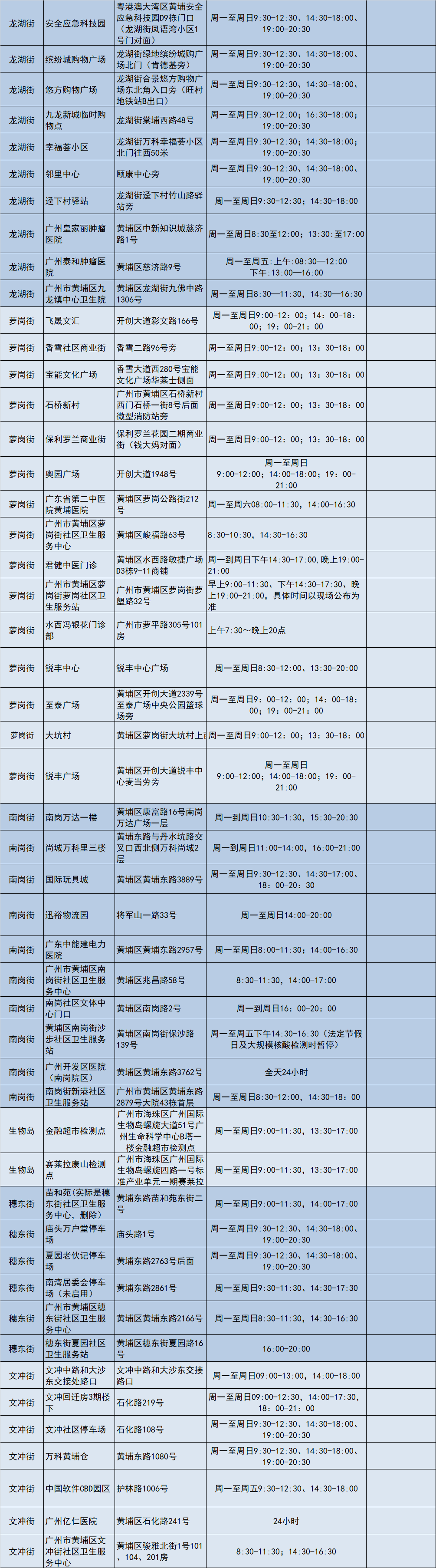 | 风神物流核酸点 | 广州市花都区九塘西路6号 | 周二、周四下午14:30-16:30 | 风神物流园区的司机及人员 | |