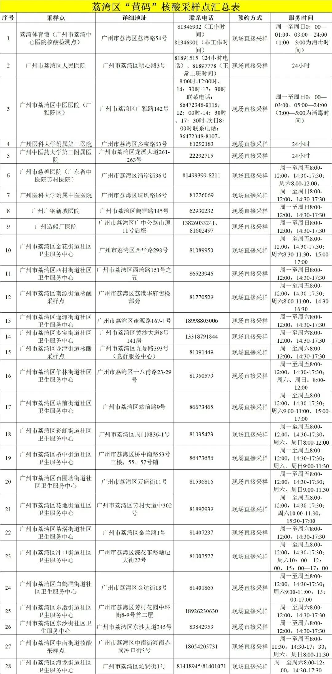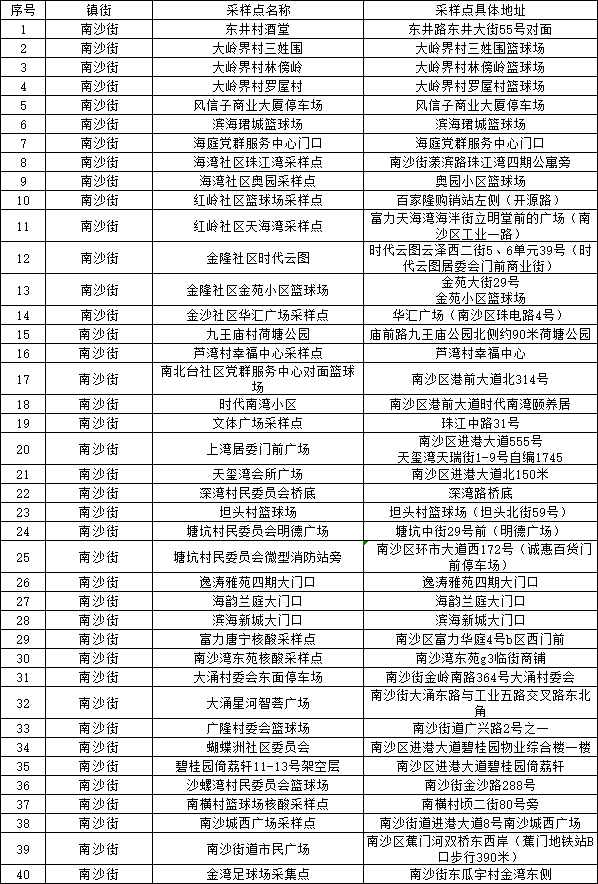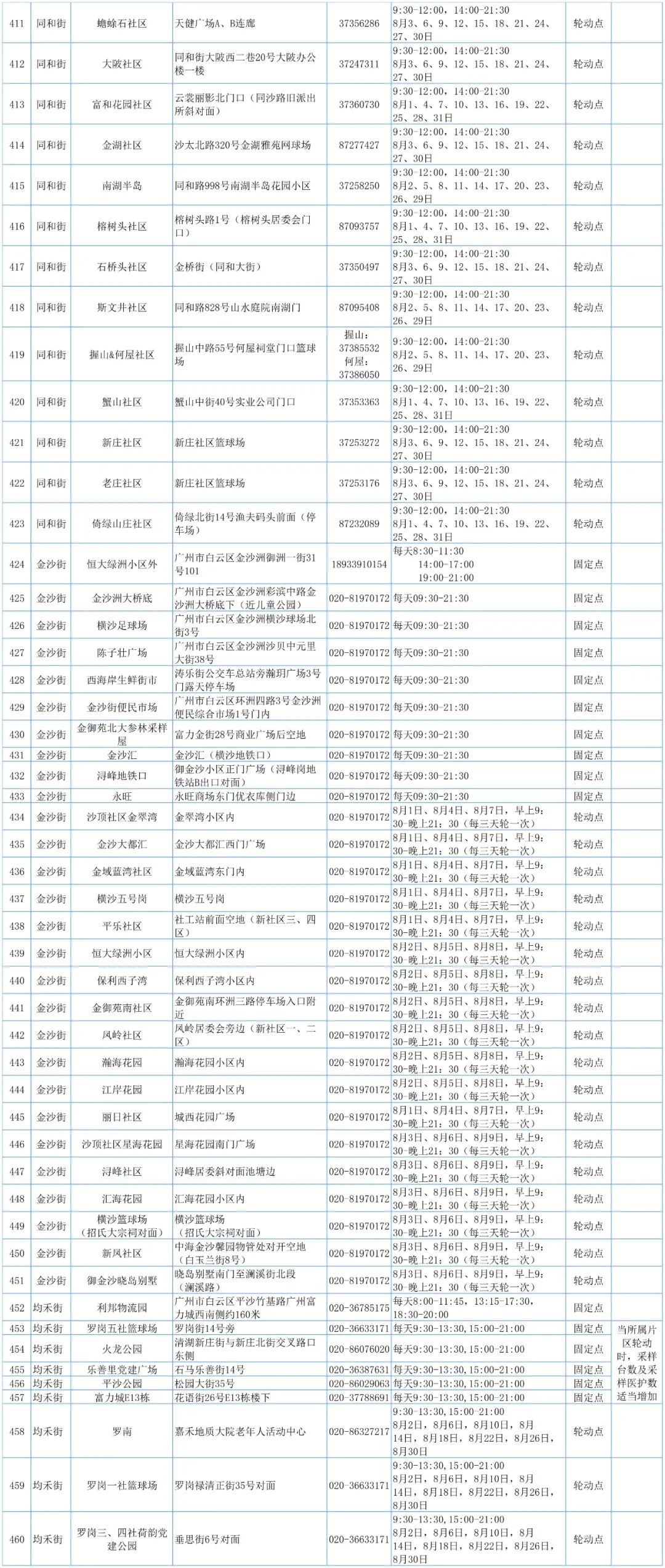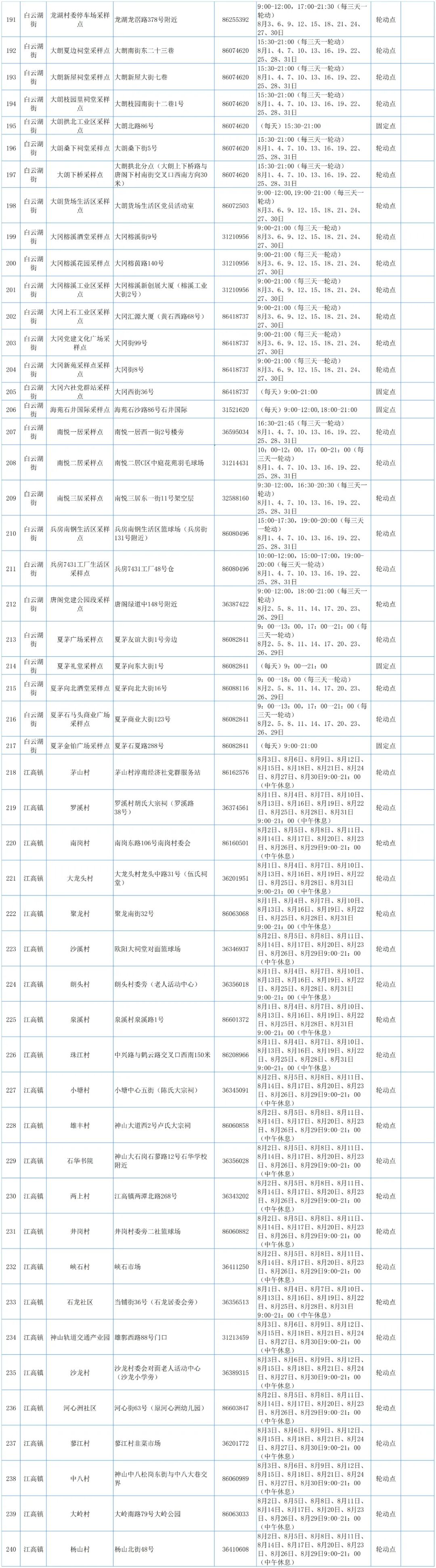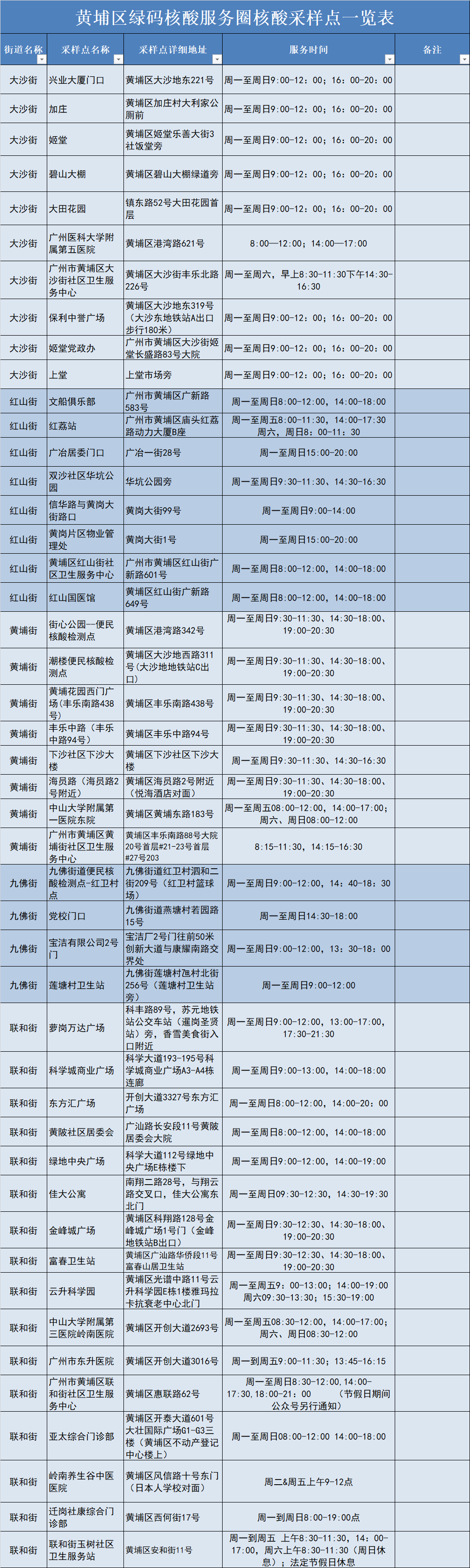 | 风神物流核酸点 | 广州市花都区九塘西路6号 | 周二、周四下午14:30-16:30 | 风神物流园区的司机及人员 | |