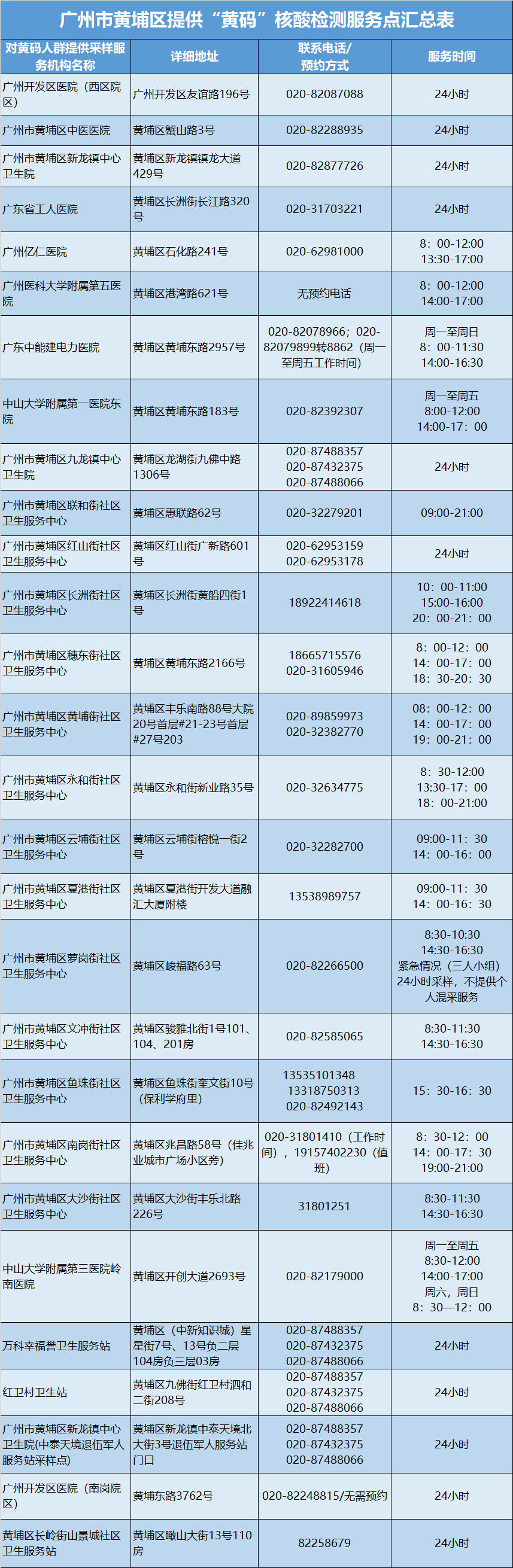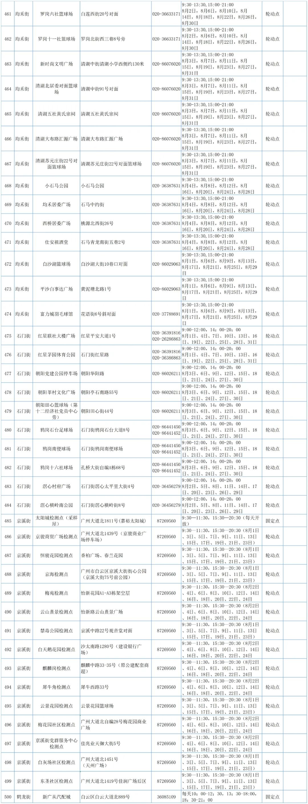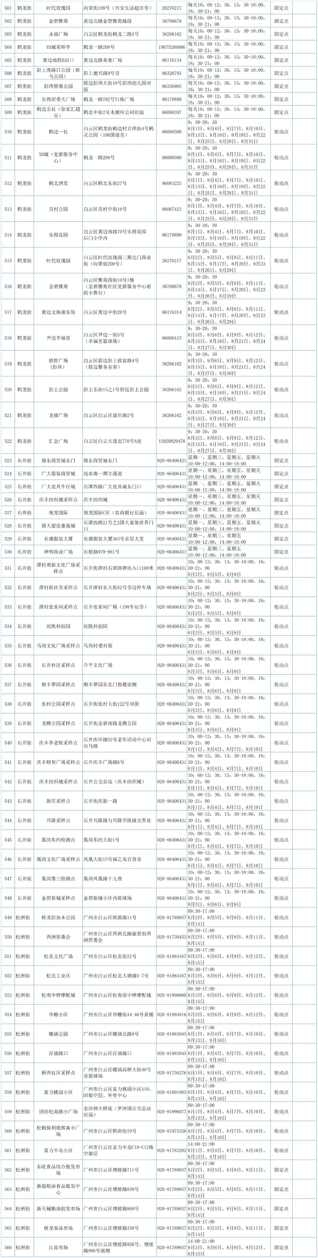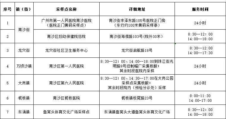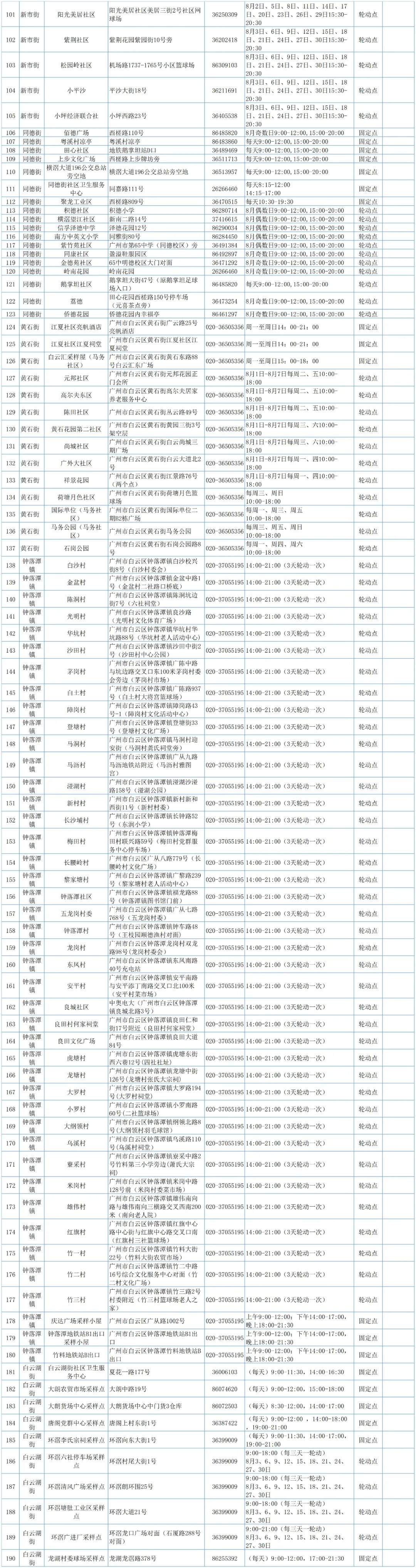| 广州北站西广场 | 广州市花都区秀全西路 | 每天:08:30-11:30,14:00-17:00 | 重点行业从业人员及愿检尽检(自费) | |