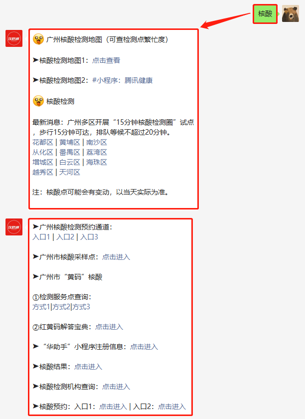 点击下方公众号【广州攻略通】,在微信后台聊天框回复关键词【核酸】,即可查看其他区核酸检测点。