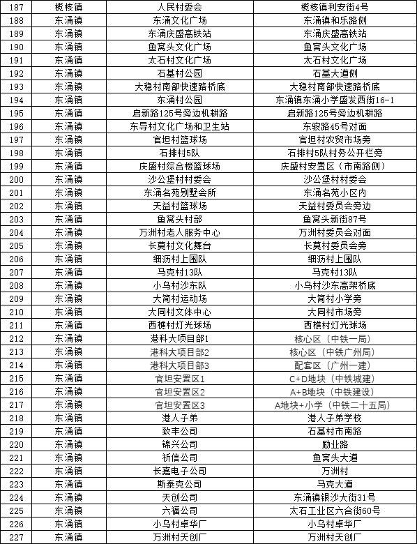| 莲塘村 | 莲塘新东经济社饭堂 | 9:00-12:30 15:00-通知撤收 | 全人群 | |