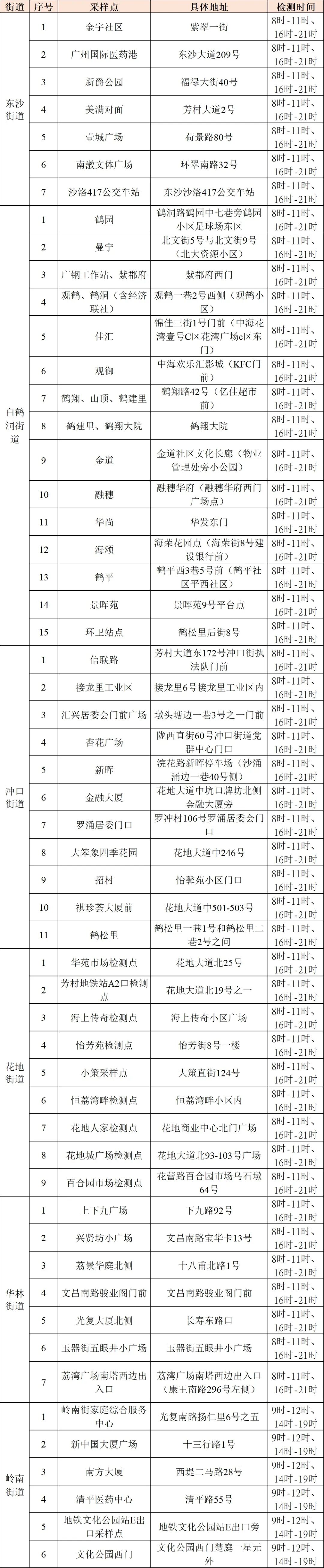 一、检测对象:荔湾区东沙、白鹤洞、冲口、花地、华林、岭南街道内所有居民,含外来人员(居家隔离和居家健康监测人员另行安排)。
