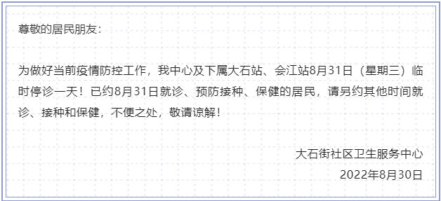8月30日,广州市番禺区大石街社区卫生服务中心发布临时停诊通告。通告全文如下: