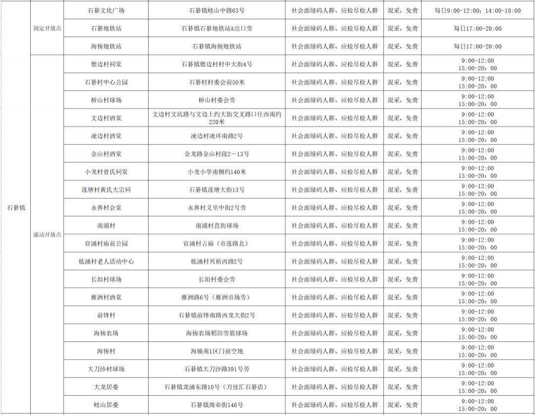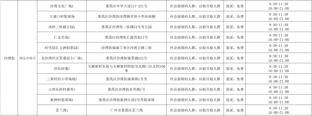 8月31日番禺区部分镇街部分区域将开展常态化免费核酸检测,具体安排如下:(部分采样点可能会因为天气等原因临时取消,以现场安排为准)