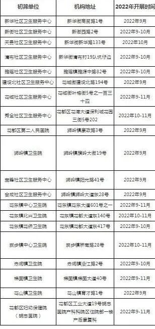 花都区妇幼保健院(胡忠医院)、花都区第二人民医院、花都区各镇卫生院、花都区各社区卫生服务中心共20家初筛单位。
