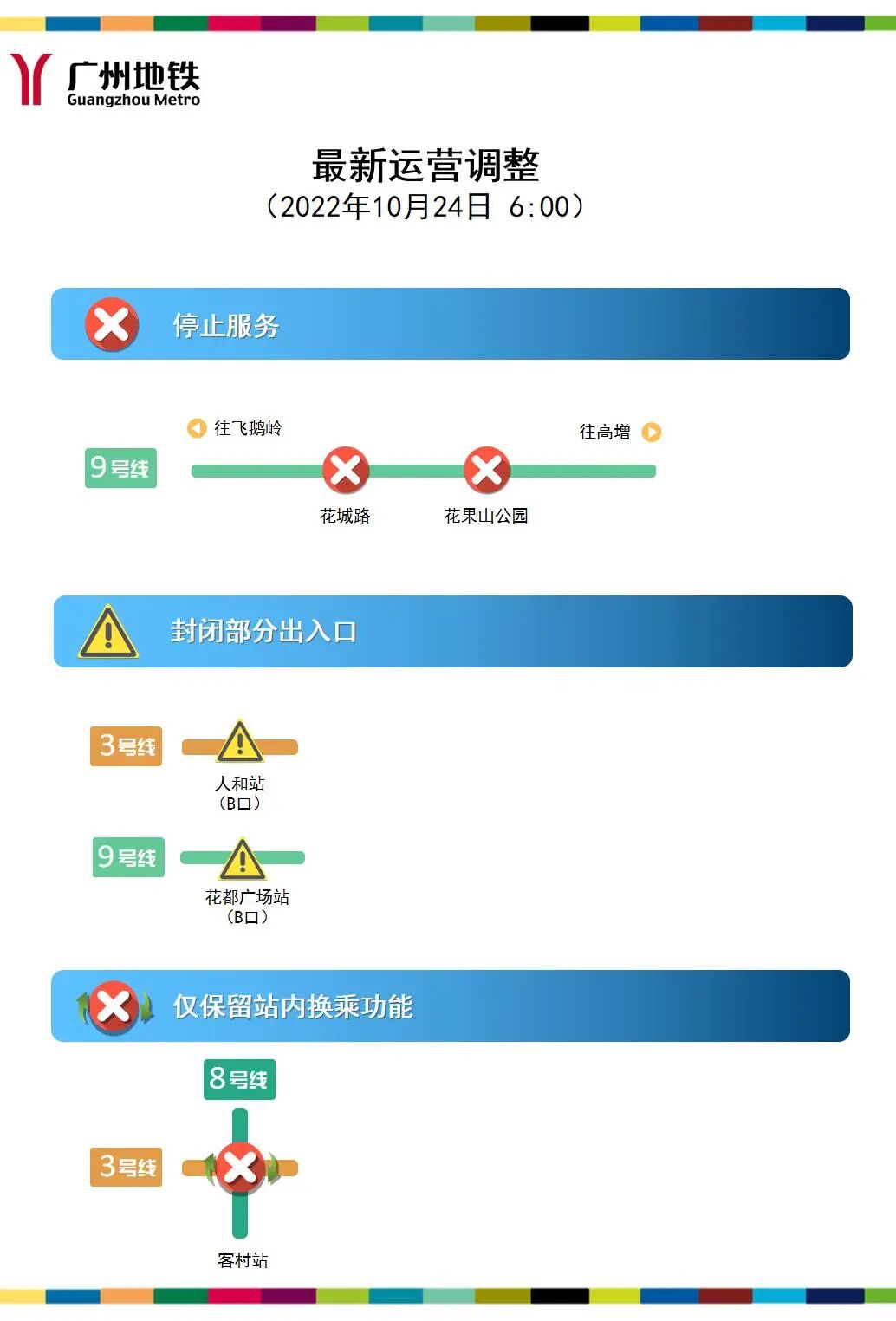 三号线及八号线客村站,九号线花城路站、花果山公园站停止对外服务,其中客村站保留换乘功能;