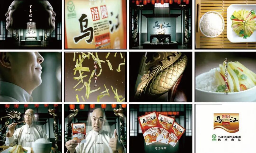 叶茂中重新包装乌江的三清三洗、三腌三榨形象,请张铁林拍了《龙柱篇》、《 幸福拍手篇》两版TVC,砸 1400万拿下央视黄金广告位。