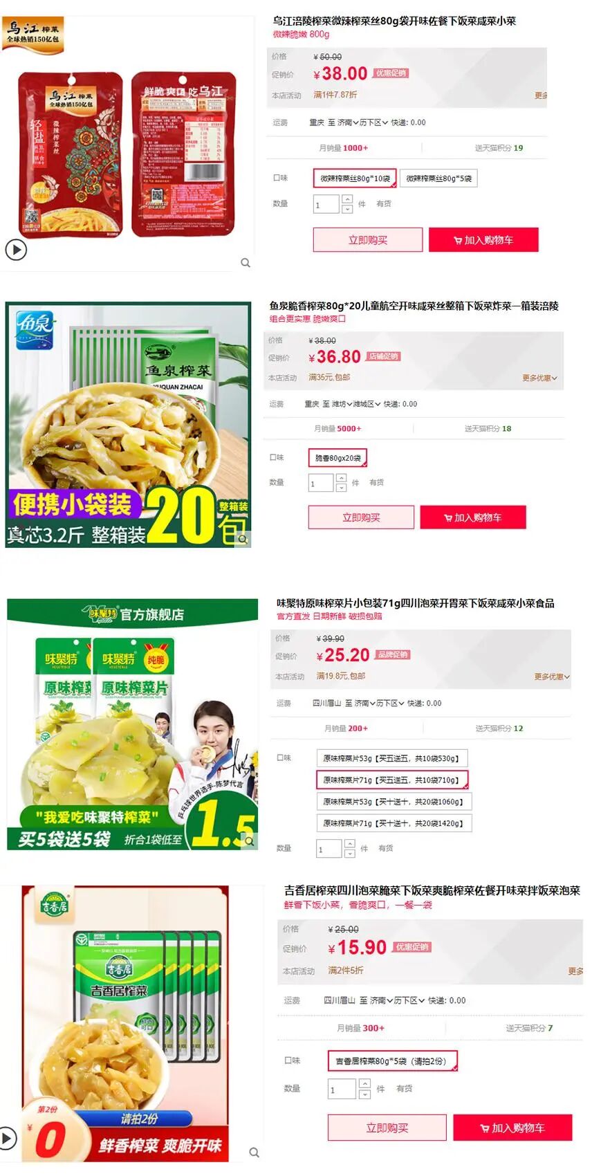 ▲天猫平台乌江、鱼泉、味聚特、吉香居四大品牌榨菜零售价对比