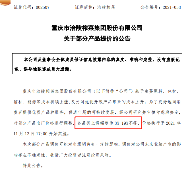 至于涨价理由,无外乎原料、包材等成本上涨。去年11月,涪陵榨菜发布公告,旗下产品再涨价3%-19%。