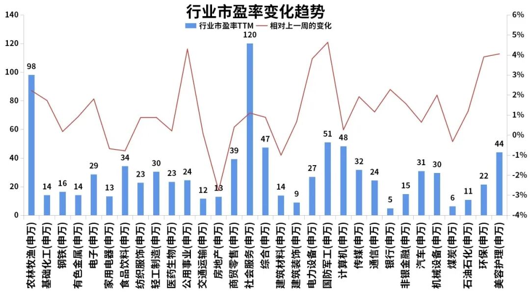 社会服务、农林牧渔和汽车处于相对高位;煤炭、有色金属和石油石化行业处于低位。