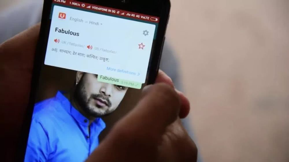 此时,这位名叫Rohit的男生走过来,拿出了手机,向他展示了手机里学英语的秘密武器——网易有道词典海外版U-Dictionary。