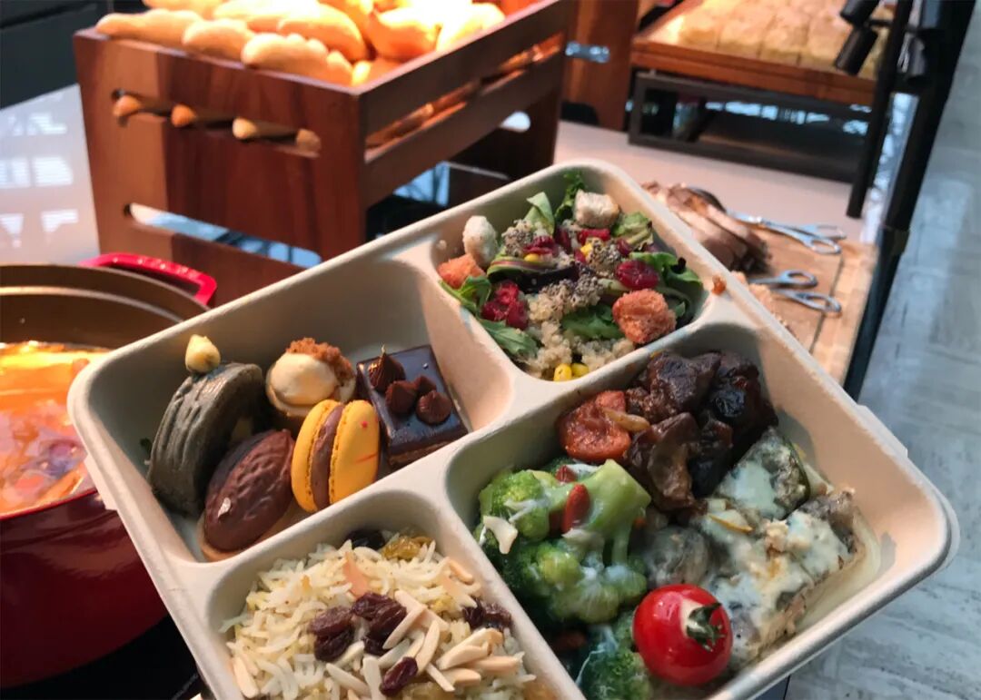 一盘盘诱人的沙茶鸡、爆炒青蟹和冰镇虎虾,在新加坡君悦酒店享用这样的自助晚餐通常要花上70美元。但如果有消费者手头预算较紧又一心关注可持续性,也可以花十分之一的价钱将这些食物“打包”一盒。