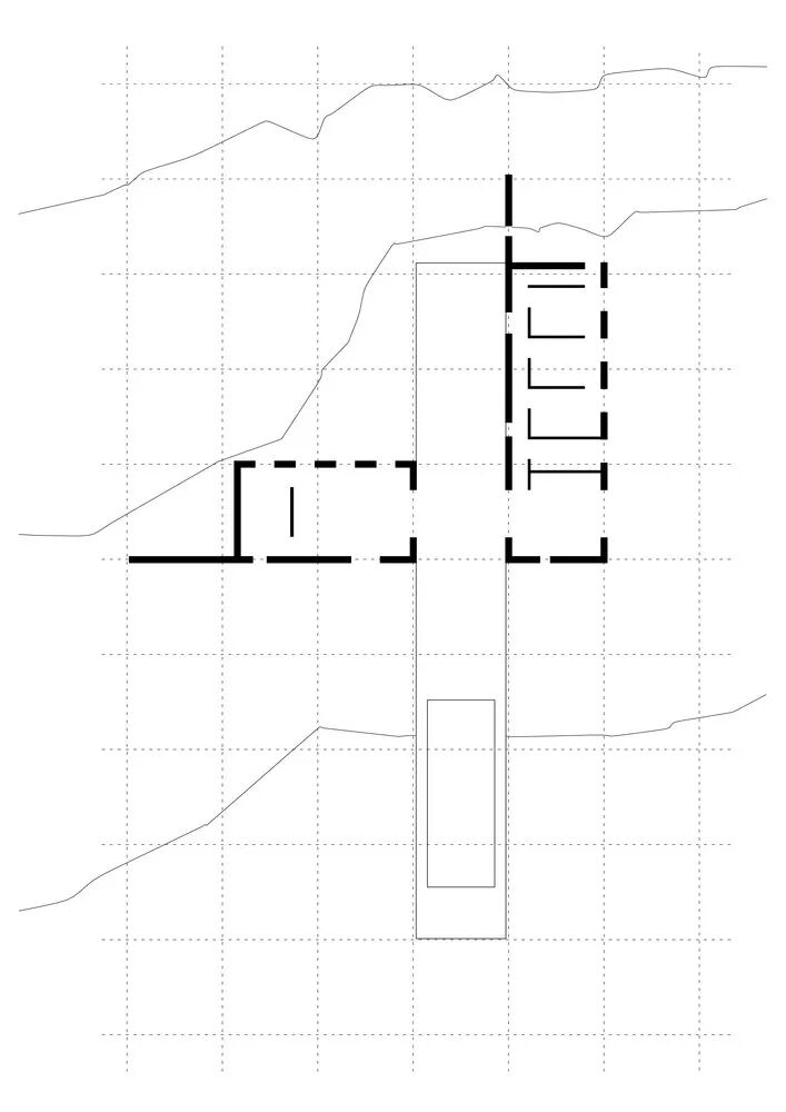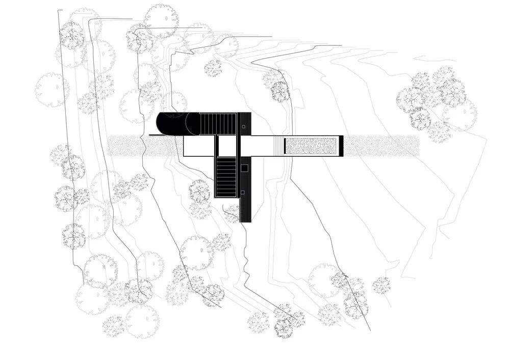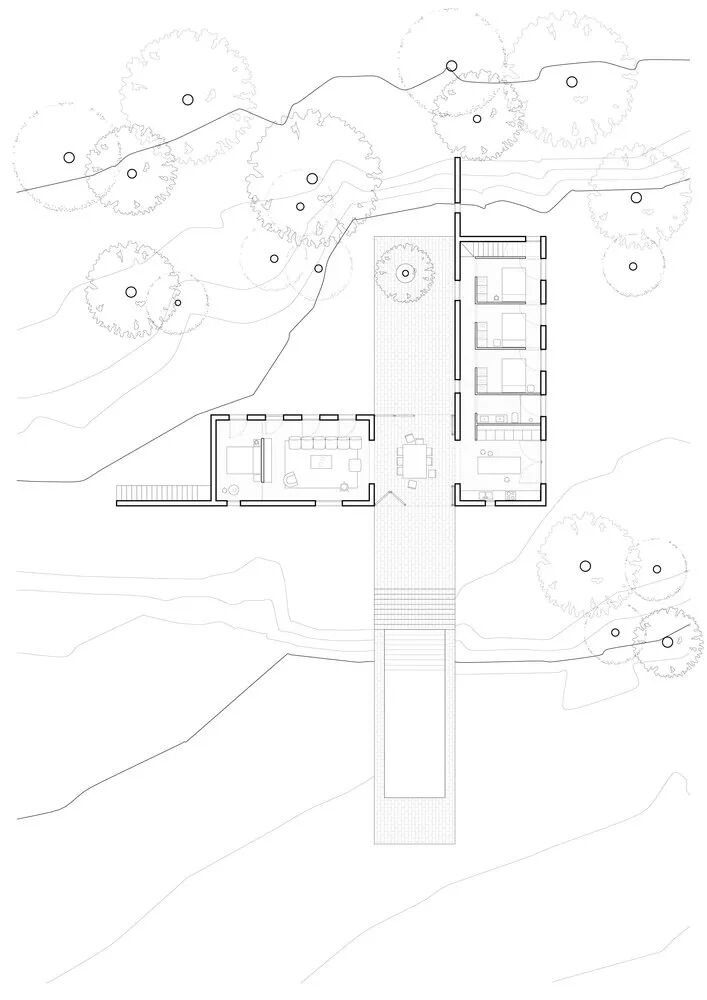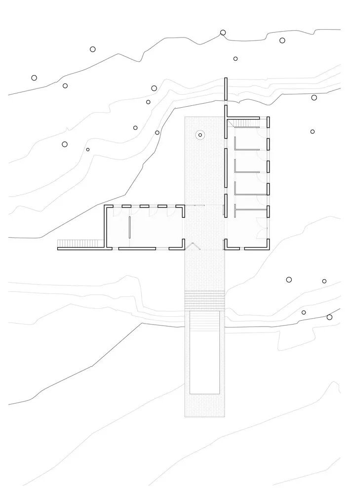 建筑形态起到了引导参观者视线的效果,每一个空间体量指向一种自然地貌,海洋,山丘和平原的景色也因此一览无余。房屋的入口指向一个由两个L形体量组成的不封闭的露台。两个L形体快分别被赋予公共职能和私人用途。其中,卫生间和卧室的布置服从了体快的形态特征,呈现出线形布局。